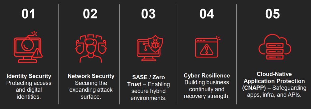โดยการลงทุนภายใน 12-18 เดือนข้างหน้าจะเน้นไปที่ 5 ส่วนหลักด้วยกัน ได้แก่ การรักษาความปลอดภัยอัตลักษณ์ (Identity Security) การรักษาความปลอดภัยเครือข่าย (Network Security) SASE/Zero Trust ความมั่นคงทางไซเบอร์ (Cyber Resilience) และการปกป้องแอปพลิเคชันบนคลาวด์ (Cloud-Native Application Protection) ซึ่งแนวโน้มเหล่านี้ สะท้อนให้เห็นถึงการปรับเปลี่ยนในเชิงกลยุทธ์ จากการลงทุนหนักด้านโครงสร้าง ไปสู่การลงทุนที่เจาะจงยิ่งขึ้น ให้ความสำคัญเรื่องความเสี่ยงเป็นหลักซึ่งสะท้อนถึงภาพรวมภัยคุกคามที่พัฒนาอย่างต่อเนื่อง
