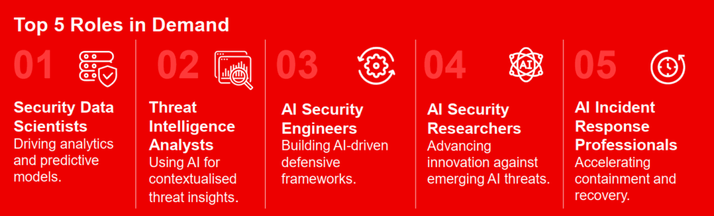 การเปลี่ยนสู่การรักษาความปลอดภัยไซเบอร์แบบ AI-first กำลังพลิกโฉมการสร้างทีมงานใหม่ สำหรับประเทศไทย งานด้านการรักษาความปลอดภัยห้าอันดับต้นที่กำลังเป็นที่ต้องการ ได้แก่นักวิทยาศาสตร์ด้านความปลอดภัยข้อมูล นักวิเคราะห์ข่าวกรองภัยคุกคาม วิศวกรด้านความปลอดภัย AI นักวิจัยด้านความปลอดภัย AI และผู้เชี่ยวชาญด้านการตอบสนองต่อเหตุการณ์ด้วย AI โดยเฉพาะ ทั้งนี้บรรดาองค์กรต่างๆ ไม่ได้แค่นำเครื่องมือ AI มาใช้เท่านั้น แต่ยังสร้างทีมงานด้านความปลอดภัยไซเบอร์ที่มีความสามารถด้าน AI ซึ่งประเด็นนี้ สะท้อนให้เห็นถึงแนวโน้มที่ขยายตัวเป็นวงกว้าง โดยคนทำงานกำลังมีการพัฒนาอย่างรวดเร็วเพื่อให้รองรับการนำเทคโนโลยี AI มาใช้งานได้อย่างทันท่วงที