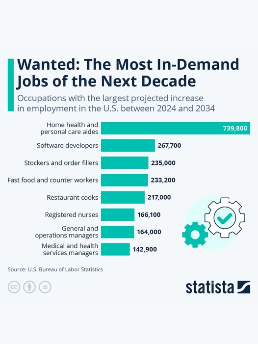 - ผู้ช่วยดูแลสุขภาพที่บ้านและผู้ดูแลส่วนบุคคล (Home Health and Personal Care Aides): คาดว่าจะเพิ่มขึ้นกว่า 739,800 ตำแหน่ง ครองอันดับหนึ่งอย่างทิ้งห่าง