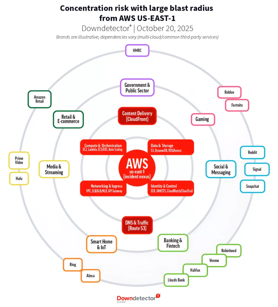 ผลลัพธ์คือหายนะทางอินเทอร์เน็ตที่แผ่ขยายไปทั่วโลก แอปพลิเคชันและเว็บไซต์ยอดนิยมหลายพันแห่ง ตั้งแต่บริการสตรีมมิงอย่าง Netflix, แอปสนทนาอย่าง Slack และ Snapchat, แพลตฟอร์มเกม Roblox ไปจนถึงบริการของธนาคาร, สายการบิน และแม้แต่อุปกรณ์ในบ้านอัจฉริยะอย่างกริ่งประตู Ring และเตียงนอนอัจฉริยะก็ไม่สามารถใช้งานได้ เว็บไซต์ Downdetector บันทึกรายงานปัญหาจากผู้ใช้กว่า 17 ล้านครั้ง จากกว่า 3,500 บริษัททั่วโลก นับเป็นหนึ่งในการล่มครั้งใหญ่ที่สุดที่เคยบันทึกมา