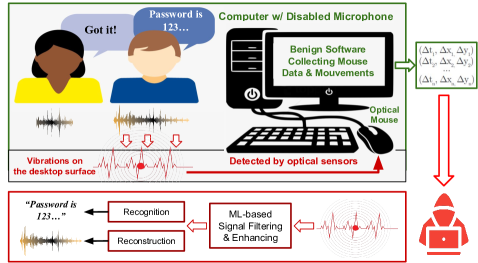 เมื่อเราพูด คลื่นเสียงจะเดินทางผ่านอากาศและกระทบกับพื้นโต๊ะ ทำให้เกิดแรงสั่นสะเทือนส่งต่อไปยังตัวเมาส์ที่วางอยู่ เซ็นเซอร์ของเมาส์จะตรวจจับการสั่นไหวเหล่านี้และบันทึกเป็นข้อมูล จากนั้นแฮกเกอร์สามารถใช้ปัญญาประดิษฐ์ (AI) เข้ามาวิเคราะห์และแปลงข้อมูลแรงสั่นสะเทือนย้อนกลับไปเป็นเสียงพูดที่พอจะระบุคำได้ โดยผลการทดลองพบว่ามีความแม่นยำในการแปลงเสียงสูงถึง 61% ซึ่งเพียงพอที่จะทำให้ AI สามารถถอดความออกมาเป็นคำศัพท์ที่เข้าใจได้