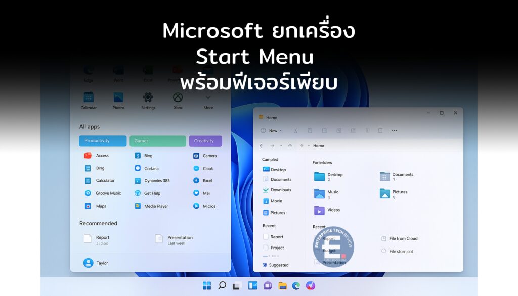 - Responsive Layout: หน้าตาของ Start Menu จะปรับขนาดตามหน้าจอโดยอัตโนมัติ บนจอขนาดใหญ่จะแสดงผลแอปที่ปักหมุด (Pinned apps) และรายการแนะนำ (Recommended) ได้มากขึ้น