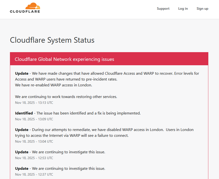 เหตุการณ์ในรอบนี้ได้รับการยืนยันจากแหล่งสถานะทางการ และมีรายงานว่าบริการหลักหลายรายการถูกจัดอยู่ในสถานะ “Degraded” หรือเสื่อมประสิทธิภาพ ซึ่งทีมวิศวกรของ Cloudflare กำลังดำเนินการแก้ไขอย่างเร่งด่วน