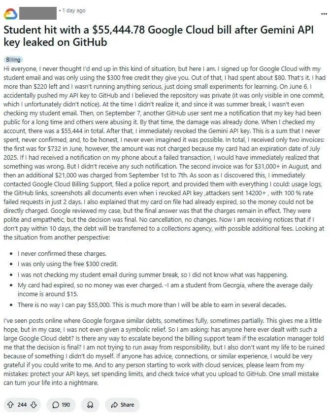 นักศึกษาวิทยาการคอมพิวเตอร์จากจอร์เจียสมัครใช้งาน Google Cloud ด้วยอีเมลนักศึกษา เพื่อทดลองเล่น Gemini API บนเครดิตฟรี 300 ดอลลาร์ของบัญชีทดลอง ซึ่งเจ้าตัวใช้เงินจริงไปไม่ถึง 80 ดอลลาร์และเข้าใจว่าตัวเองยังอยู่ในโหมด “เล่นฟรี” อย่างสบายใจ. จุดหักเหเกิดขึ้นเมื่อเขาเผลอนำ Gemini API key ขึ้น GitHub โดยคิดว่าที่เก็บโค้ดเป็นแบบ private ทั้งที่จริงเป็น public ทำให้บอตและผู้ไม่หวังดีสแกนเจอและเริ่มยิงคำขอเข้า API แบบถล่มทลายในเวลาต่อมา.