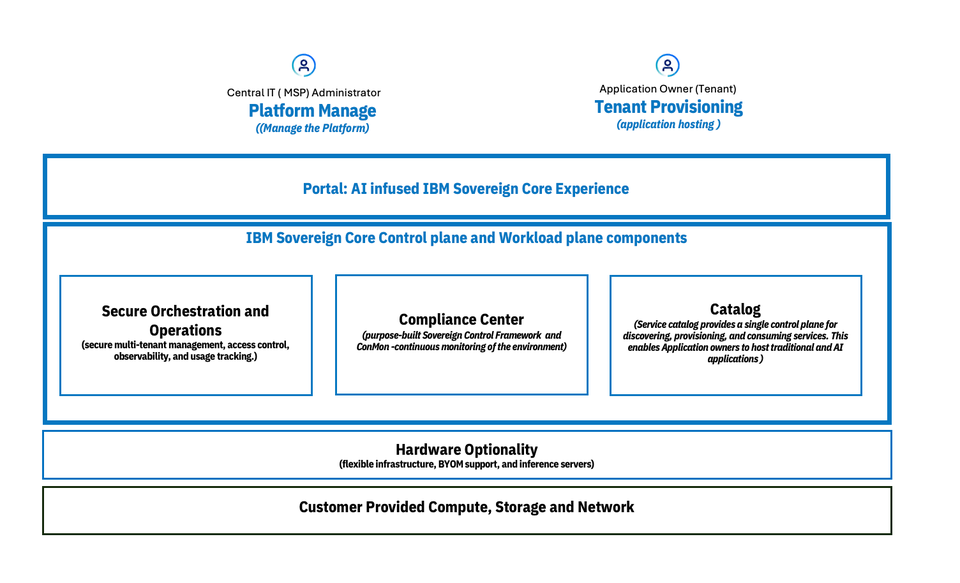 Sovereign Core ของ IBM จะไม่ใช่ “คลาวด์อธิปไตย” ที่ผูกกับตำแหน่งศูนย์ข้อมูลเฉพาะเจาะจงตามแนวคิดของผู้ให้บริการรายอื่น ๆ แต่เป็น สแตกซอฟต์แวร์ที่ช่วยสร้างสภาพแวดล้อมคลาวด์อธิปไตยได้บนฮาร์ดแวร์ขององค์กรเอง หรือบนผู้ให้บริการคลาวด์ท้องถิ่นหรือบริการจัดการอื่น ๆ ซึ่งช่วยให้ CIO และทีมไอทีสามารถควบคุมได้ทั้งการจัดเก็บ การเข้ารหัสคีย์ และการจัดการข้อมูลภายในขอบเขตของกฎหมายและข้อบังคับของประเทศนั้น ๆ