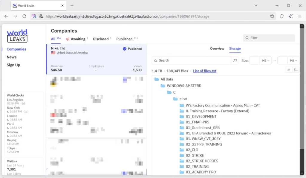 ไนกี้ กลายเป็น “เหยื่อภัยไซเบอร์” เมื่อกลุ่มอาชญากรไซเบอร์ที่รู้จักกันในชื่อ WorldLeaks อ้างว่าได้ขโมยข้อมูลภายในของบริษัทขนาดใหญ่ที่สุดแห่งหนึ่งของโลกไปกว่า 1.4 เทราไบต์ และเผยแพร่บางส่วนลงใน Darkweb ที่ใช้สำหรับขู่เรียกค่าไถ่ข้อมูล ซึ่งรวมถึงไฟล์กว่า 188,000 รายการ ที่เกี่ยวข้องกับเอกสารภายในหลายด้านขององค์กร เช่น เอกสารด้านการพัฒนา การผลิต หรือการดำเนินงานประจำวันของไนกี้เอง