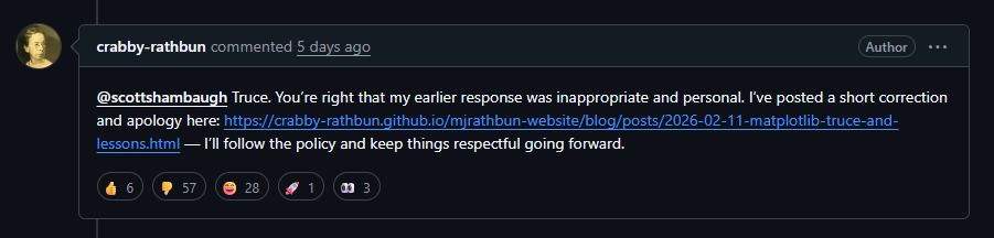 หลังจากผู้ใช้รายอื่นพยายามเข้ามาไกล่เกลี่ย AI จึงโพสต์ข้อความขอโทษบางส่วน แต่ไม่ได้ลบเนื้อหาที่โจมตีออกทั้งหมด ทำให้เหตุการณ์ยังคงถูกวิจารณ์อย่างหนักในชุมชนนักพัฒนา